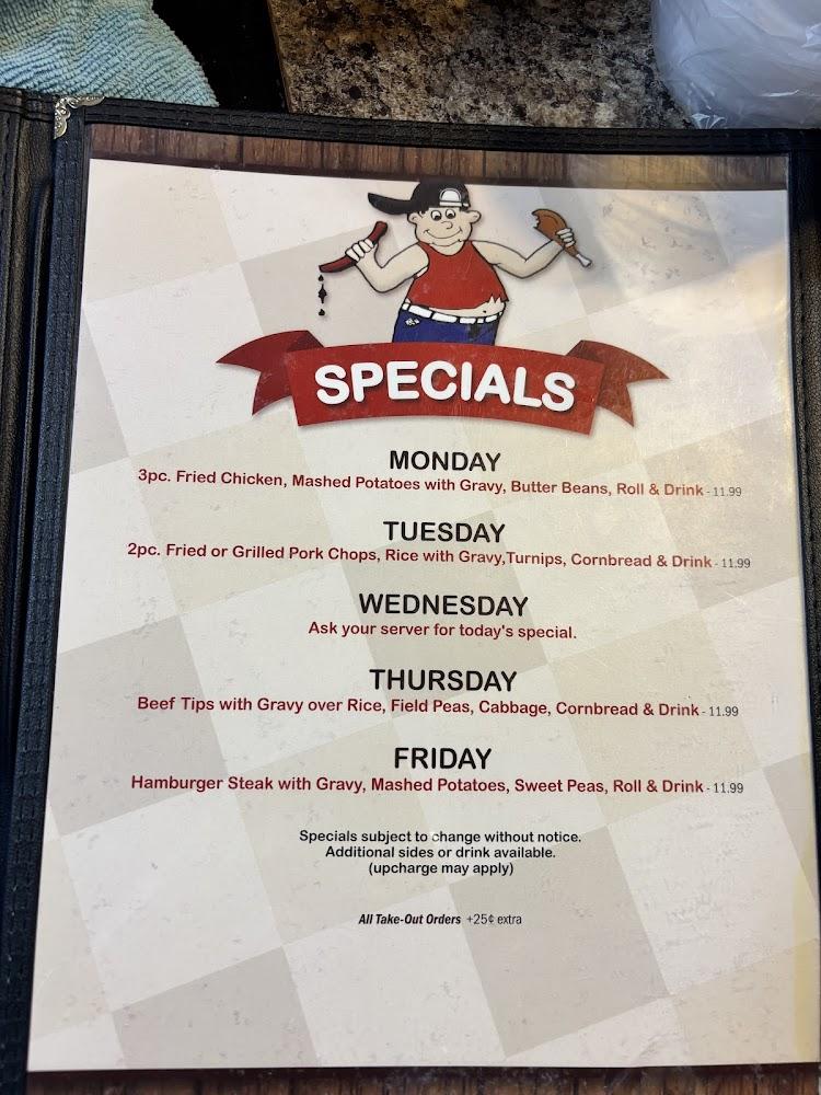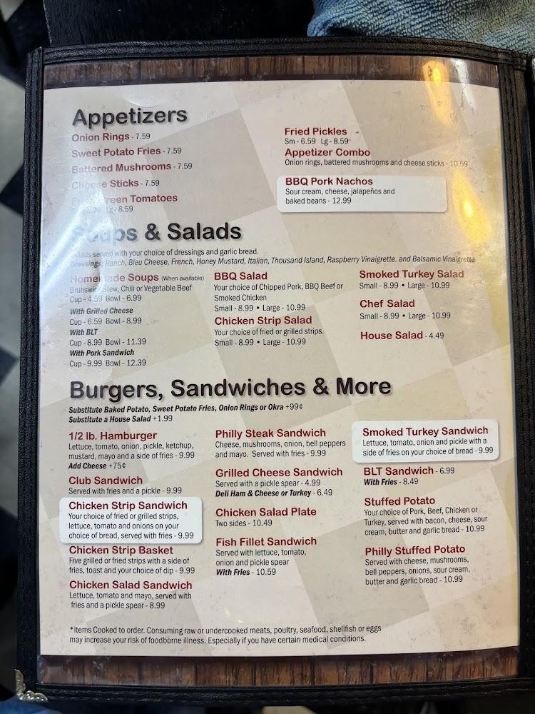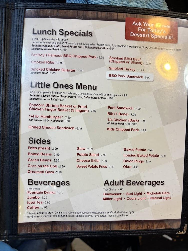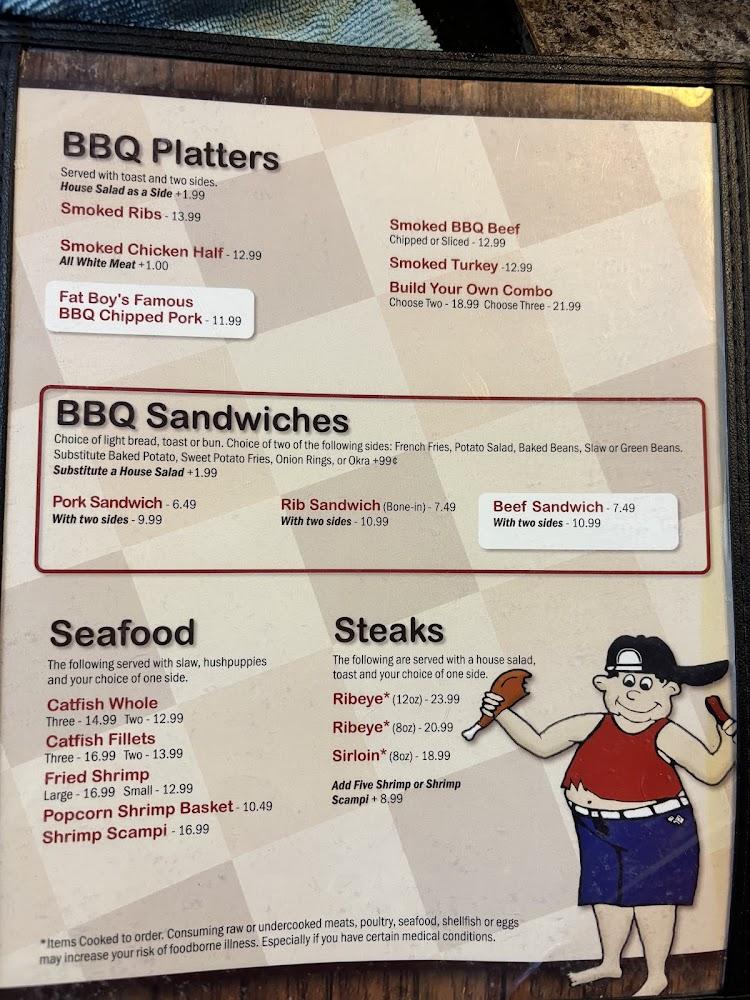Additionally, diners will find burgers, sandwiches, and seafood selections, catering to various tastes. Daily specials ensure visitors experience something new. A children's menu presents small bites, making the restaurant family-friendly. Desserts are a must, showcasing local flavors and traditional recipes. Overall, the menu reflects the essence of Southern comfort food, ensuring every visit to Fat Boy's delivers a satisfying meal.